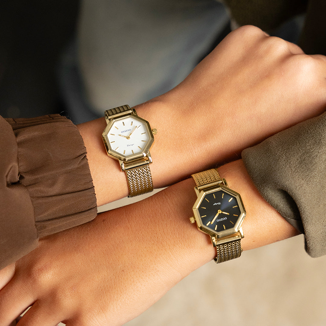 The classic look stays key in this trendy series and therefore, this octagon OOZOO vintage design with a playful wink is the season must-have! This ladies watch is the perfect combination of fashion and comfort with its 28x28 mm gold coloured metal watch case and white dial. The gold coloured metal v-mesh bracelet makes this watch a trendy accessory, which you can wear every day. The dial has gold coloured stripes digits and matching hands. The C20436 adds the sparkle to your outfit. The mineral glass lays in a mm slim metal watch case with IP-plating. This design has a stainless steel backplate and is nickel safe. This watch has a 2ATM Japanese movement and is covered by a 2 year warranty (see section 3 of our Refund, shipping & warranty policy).